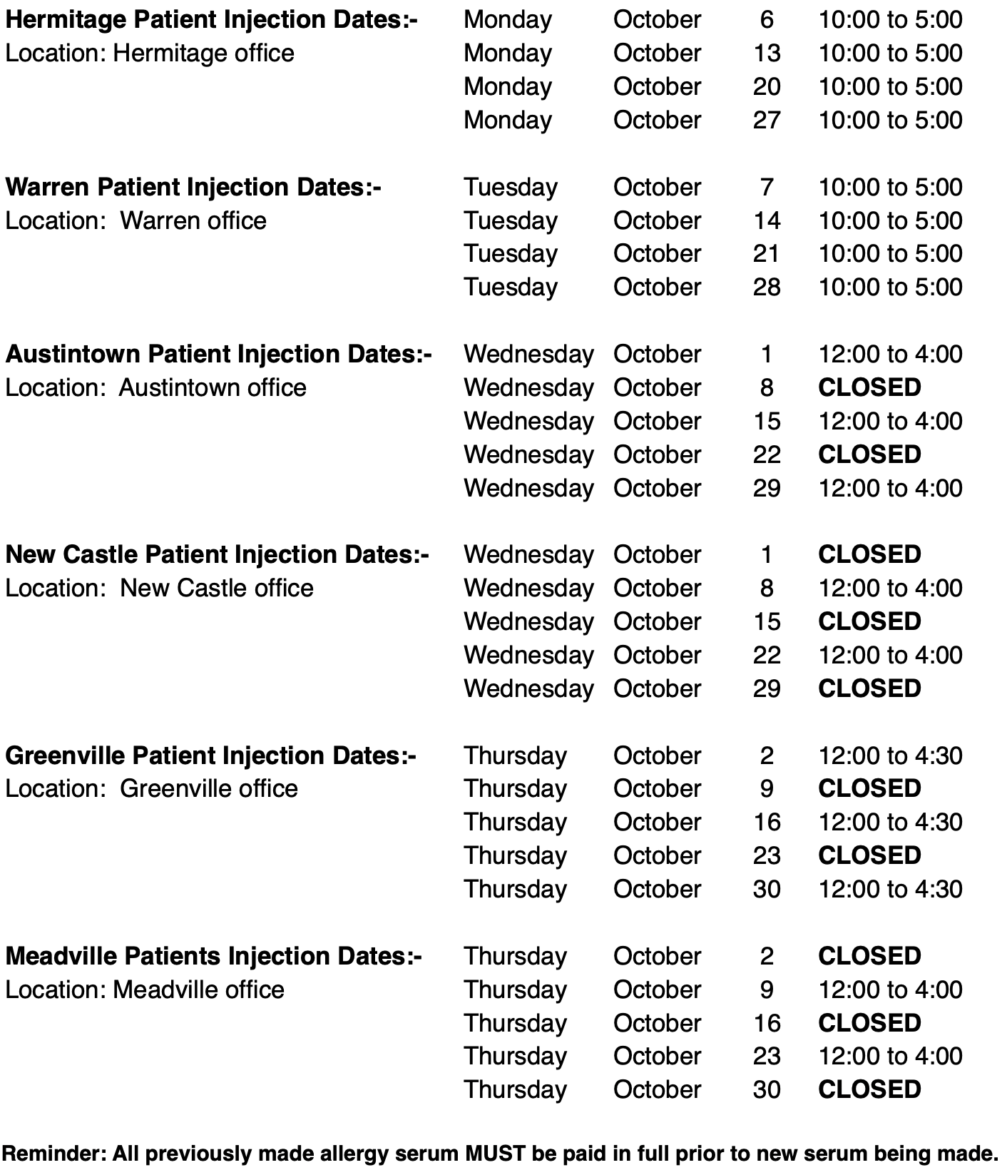 Attention Allergy Injection Patients: For your safety, you MUST have your allergy injection sign-in card with you in order to receive your allergy injections. Bypassing the safety protocols places you and other patients at risk for receiving the wrong injection. You will be charged $10.00 for a replacement card after 2 cards have been issued.